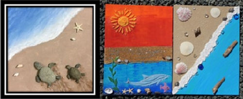 Paint and decorate your own unique beach themed painted collage art on canvas. First you will apply some plaster designs then choose from a variety of paint colors, sand, shells, starfish, gems, foliage cut outs and many more items to select from.