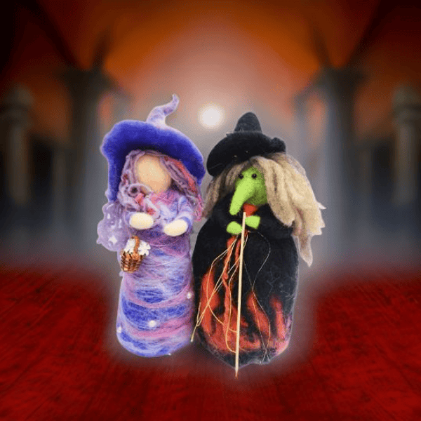 Create your own unique felted fairy or witch from our many colors of wool roving, spun wool and mill ends. You can then accessorize your fairy or witch from our selection of baskets, flowers, cauldrons and spiders. The felting needles are sharp so extra care is needed when making these.
