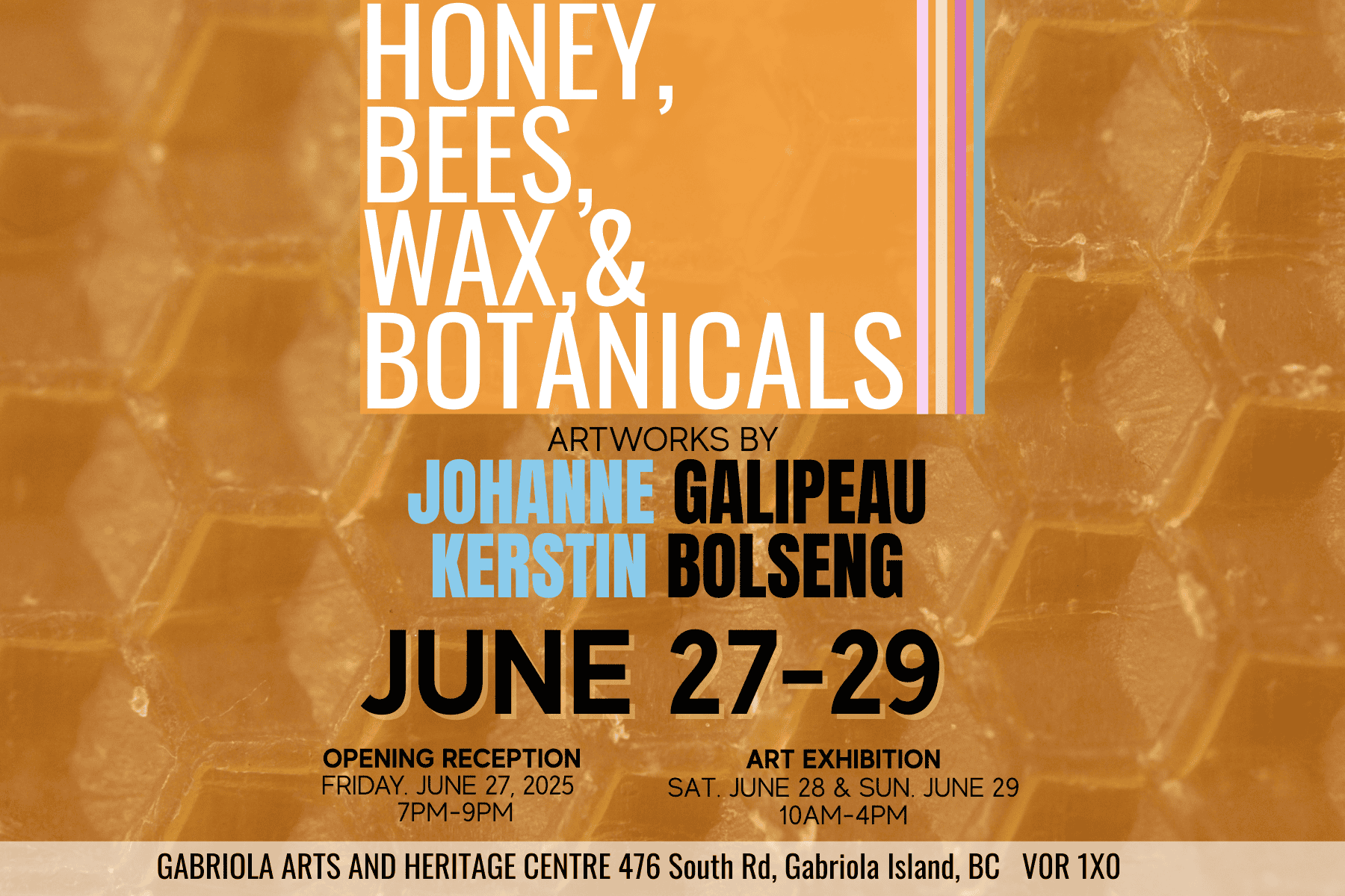 Please join us for “Honey, Bees, Wax, and Botanicals”, an exhibition of artworks by Johanne Galipeau and Kerstin Bolseng at the Gabriola Arts & Heritage Centre on Gabriola Island, BC.